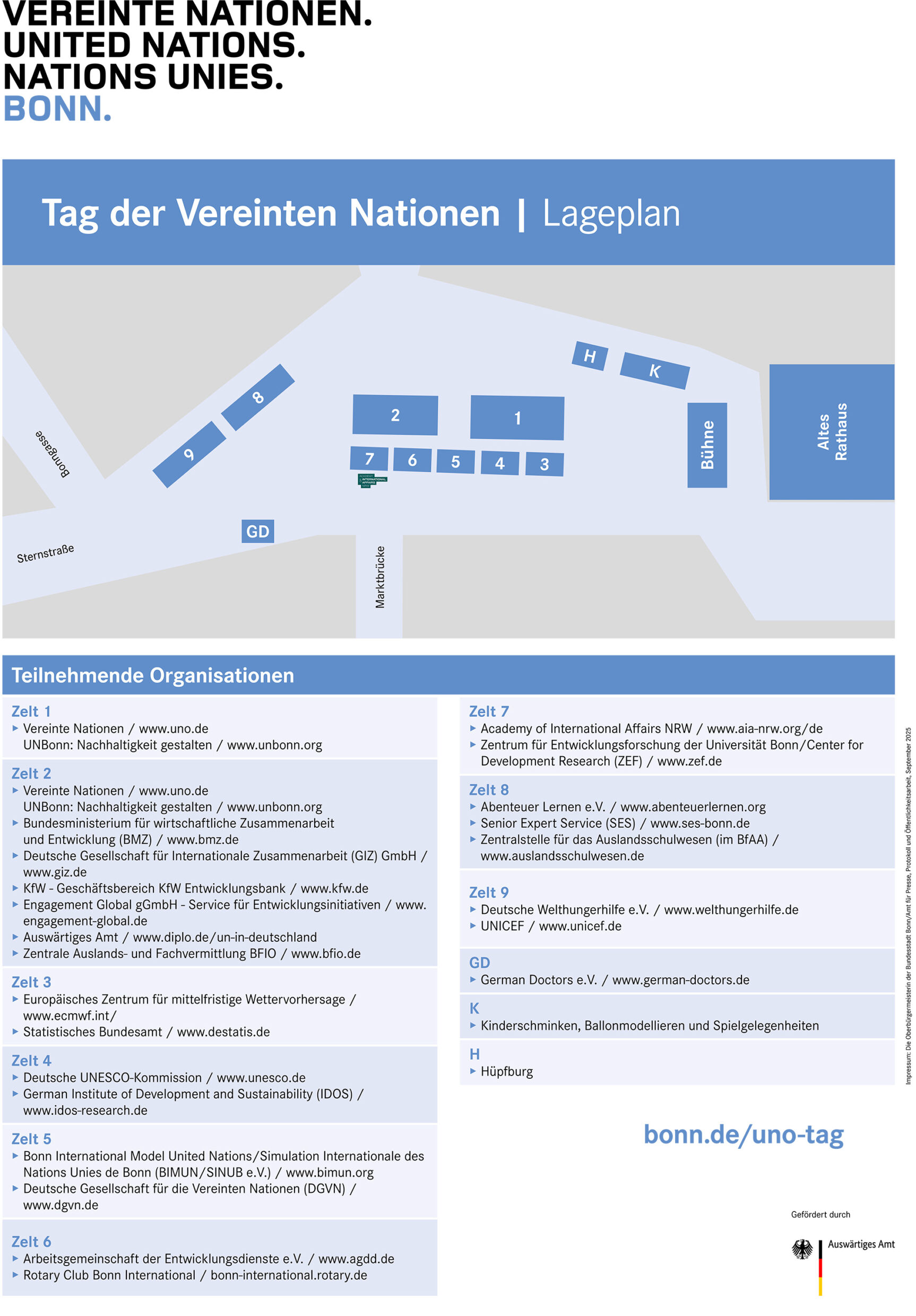 Since 1996, Bonn has celebrated United Nations Day every October to commemorate the ratification of the UN Charter on October 24, 1945. At this event on Bonn’s market square, numerous UN organizations based in the city, as well as other associations and groups, will present themselves in a tent city and provide information on a common theme, which since 2015 has focused on the Sustainable Development Goals. In addition to presentations and information stands, there will be a colorful stage program for the whole family, bringing the work of the UN in Bonn closer to the people.